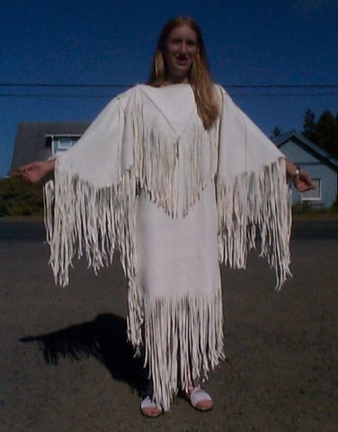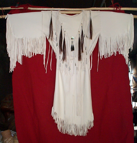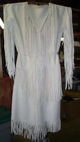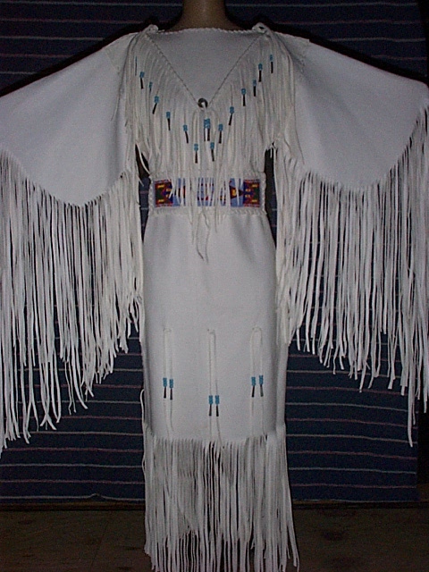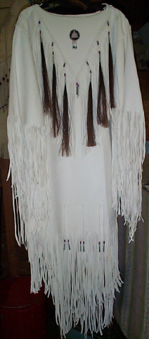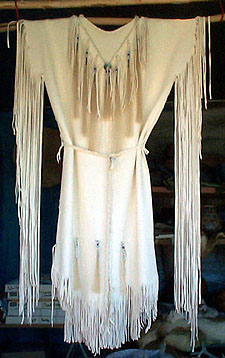 | All white deer or elk hide dresses are made smooth side, or suede side out, with your choice of decoration. Please e-mail me for pricing, or with any other questions you may have. I will be happy to answer any and all of your questions. Each garment is made only from the best quality hides available. Loom beadwork is also availabke in any color or pattern. I sew all beadwork onto the dresses by hand. Moccasins ordered to match are also available upon request. |