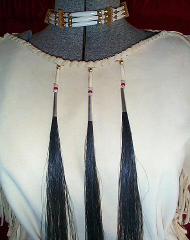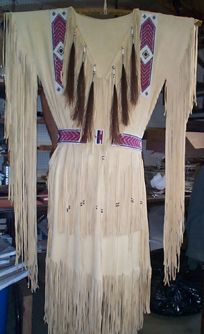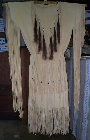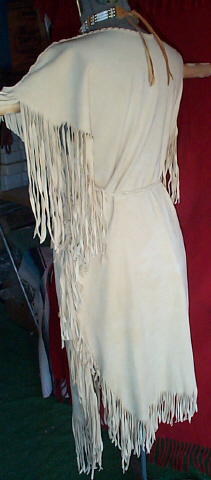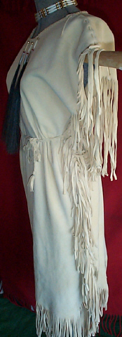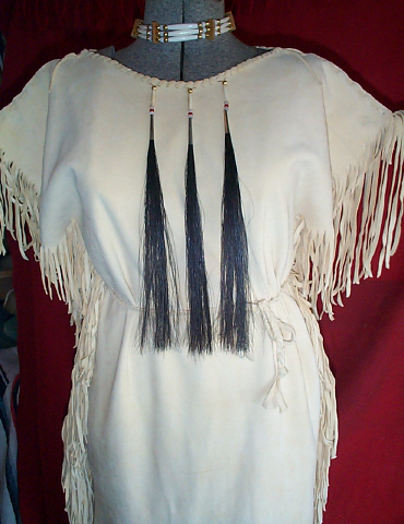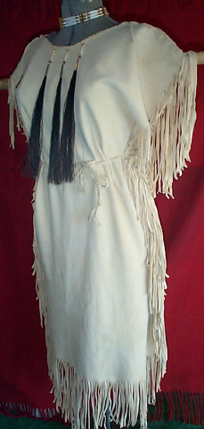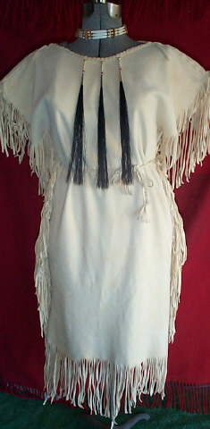 | These beautiful, commercial brain tan (oil tan) dresses are handmade from the softest deer hide, with the suede side out, and are an outstanding beige/vanilla color. The dress shown is decorated with glass and brass beads, bone hairpipes and tin cones, with horse hair tassels. This style can be worn with or with out the belt, and is hand braided to tie around the waist. Please e-mail with any questions, and I will be happy to assist you. |