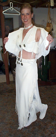 | If you can imagine it, we can create it! Here is an example of a custom, made to order ensemble, consisting of bodice, vest jacket, skirt and moccasins, with bone hairpipe, glass beads, and silver conchos. |