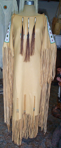 | Here are two beautiful examples of elk hide dresses, each with two strips of loom beadwork running along either shoulder. They are each decorated with glass beads, bone hairpipe and tin cones, with horsehair tassels. Please e-mail for an estimate, and I will be happy to help create your perfect regalia. |